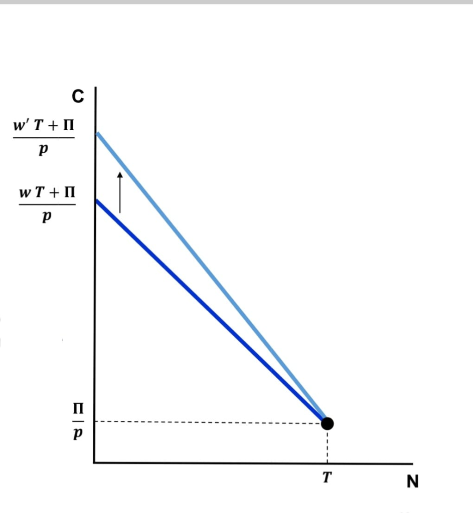 Ci sono diverse opzioni: se la sua scelta si trovava sulla retta di bilancio di colore blu, potrà scegliere di consumare la stessa quantità di C ma avendo a disposizione più tempo libero N. In alternativa, potrebbe dedicare parte del tempo libero guadagnato ad una seconda occupazione, in modo tale da aumentare il suo potere d’acquisto e consumare ancora più quantità di C.