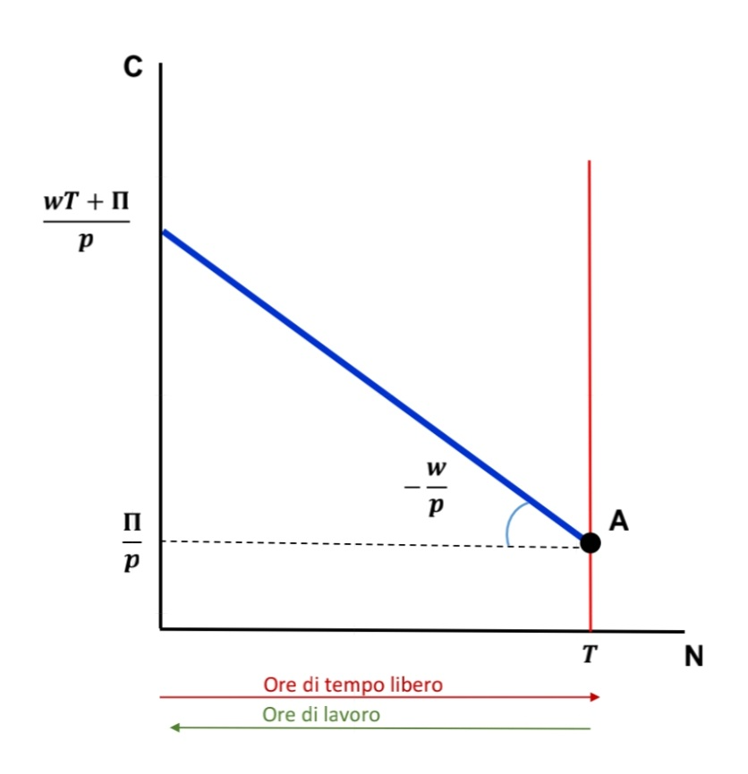 Si può anche tracciare un grafico che ha C sull’asse delle ordinate e N sull’asse delle ascisse. La retta blu rappresenta quei punti in cui il lavoratore spende tutto il suo reddito.